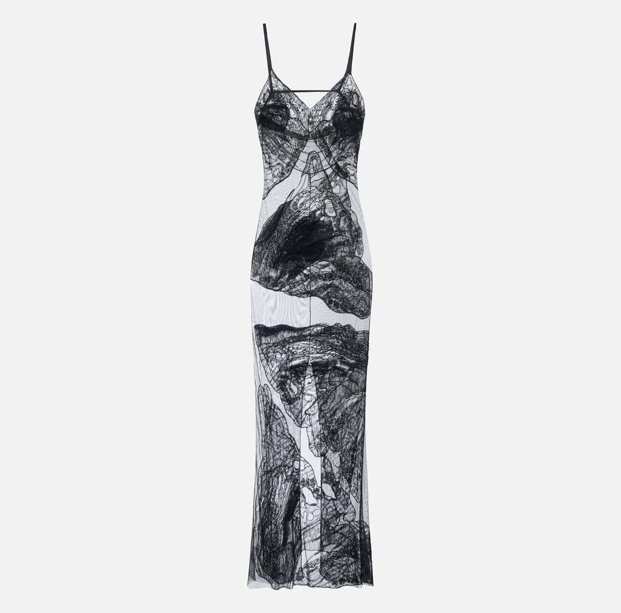 Evening dress in tulle fabric with slim fit. The dress has thin straps and hooded back neckline. It is characterised by embroideries, with an abstract shape inspired by butterfly wings and embellished with lace, crystals and micro-ruffles. 100%Polyamide